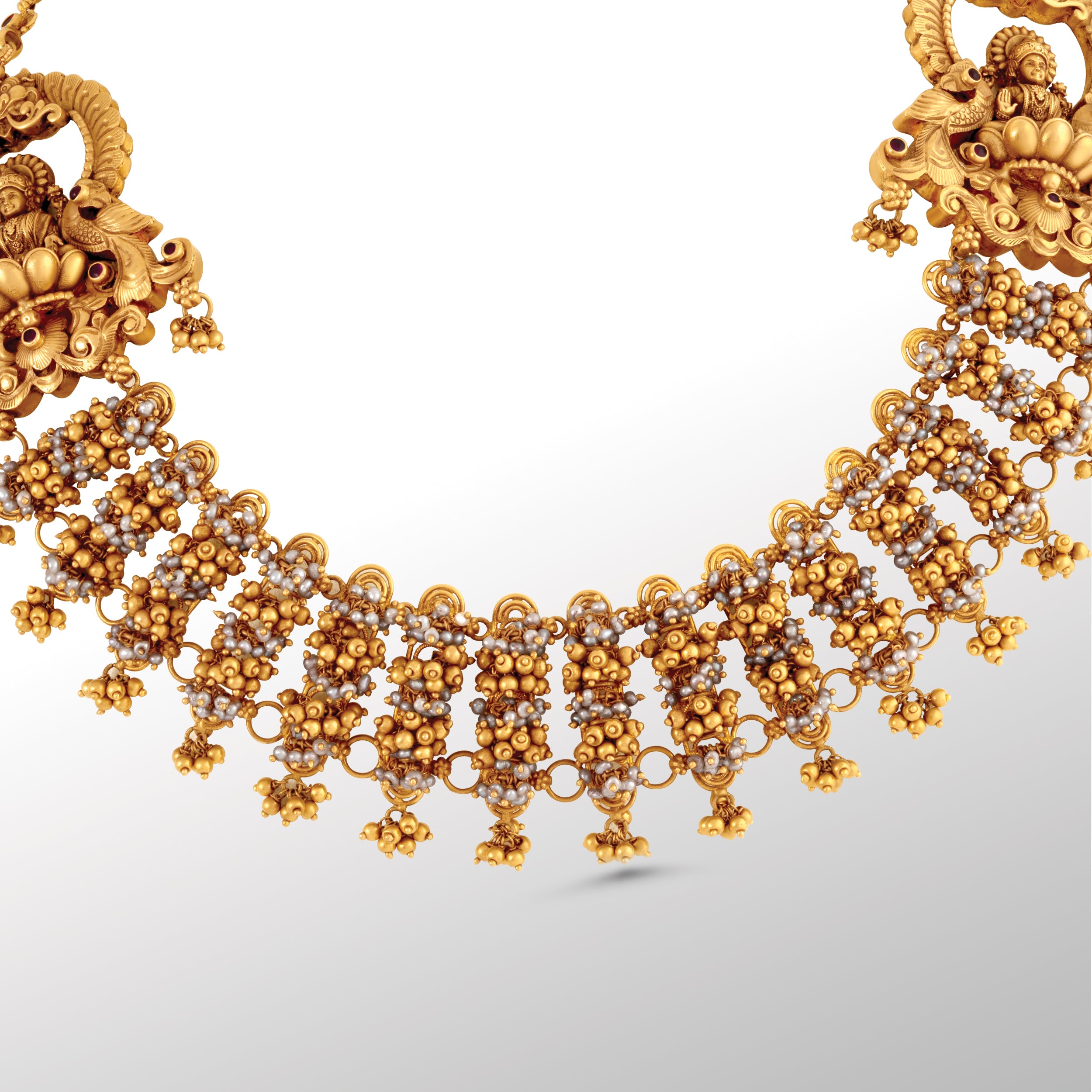 The Ananta Temple necklace is where divinity meets design. Inspired by the grandeur of temple heritage, it is adorned with intricate motifs that embody grace, power, and eternity. Its bold yet elegant silhouette radiates timeless charm, making it a statement piece that honours tradition while embracing modern sophistication.